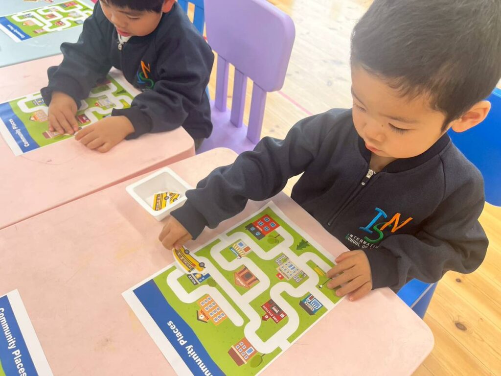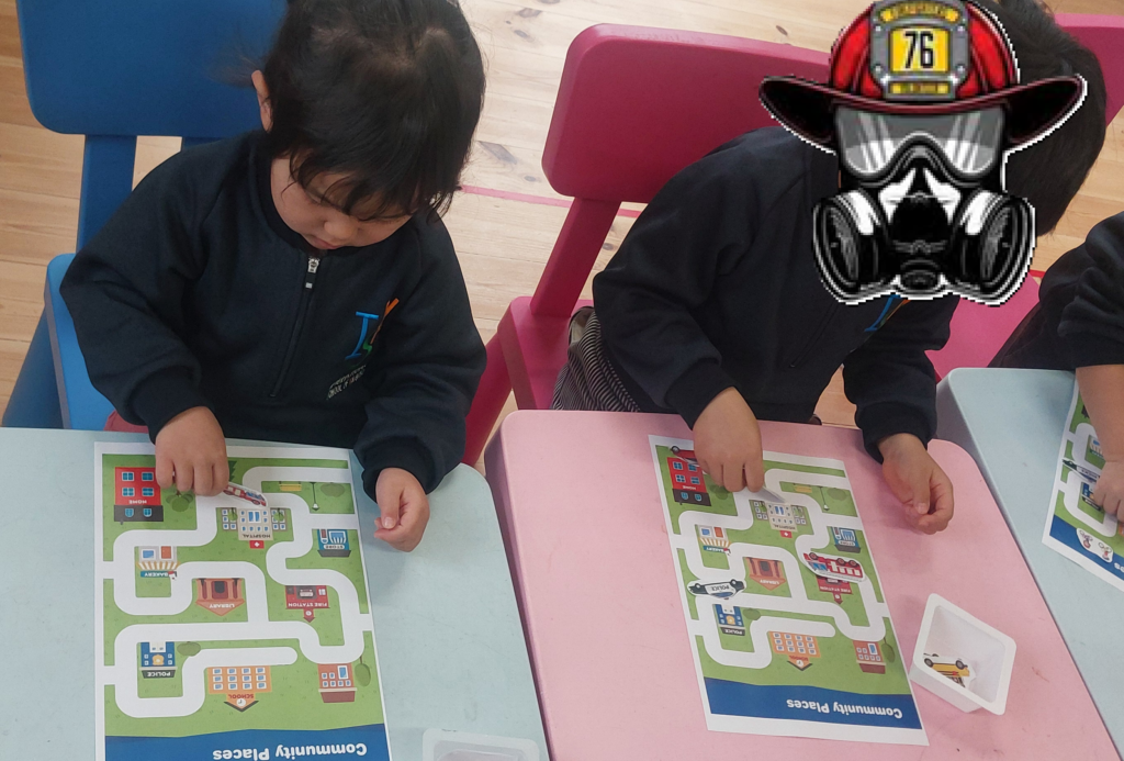 LOI 2 is all about getting from place to place safely—so, Waterfall students played a little RED Light GREEN Light and looked both ways before crossing the road! In fact, there are so many vehicles on the road! We had to ask— Where do the vehicles belong? Students thought carefully and said we should not stop cars in front of the Fire Station because the Fire Truck is there. They matched all the different vehicles around the community to their buildings and added some traffic signs for safety!