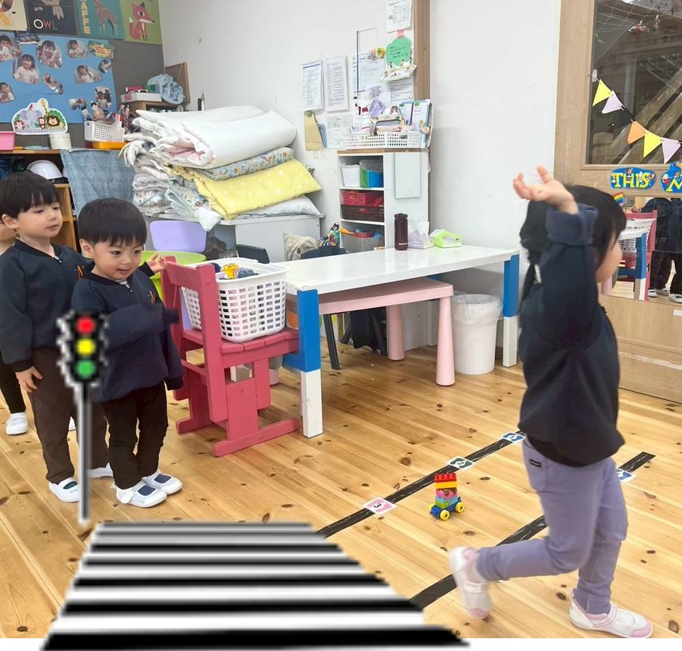 LOI 2では、「安全に目的地まで移動すること」について学んでいます。そこでWaterfallの子どもたちは、実際に道路を渡ることを想定して「Red LightなのかGreen Lightなのか確認して」、「右と左どちらもよく見て」道路を渡る練習をしました。