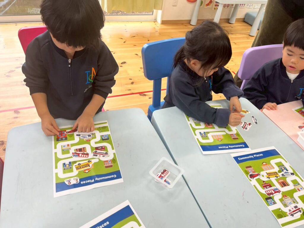 道路には本当にたくさんの乗りものが走っています。そこで、「乗りものはどこにいるのがいいかな?」とみんなで考えてみました。子どもたちはよく考えて、「消防署の前に車を止めたらだめだよ。消防車が出られなくなっちゃうから!」と気づきました。地域にある建物とさまざまな乗りものを正しく組み合わせ、安全のために交通標識も加えました。
