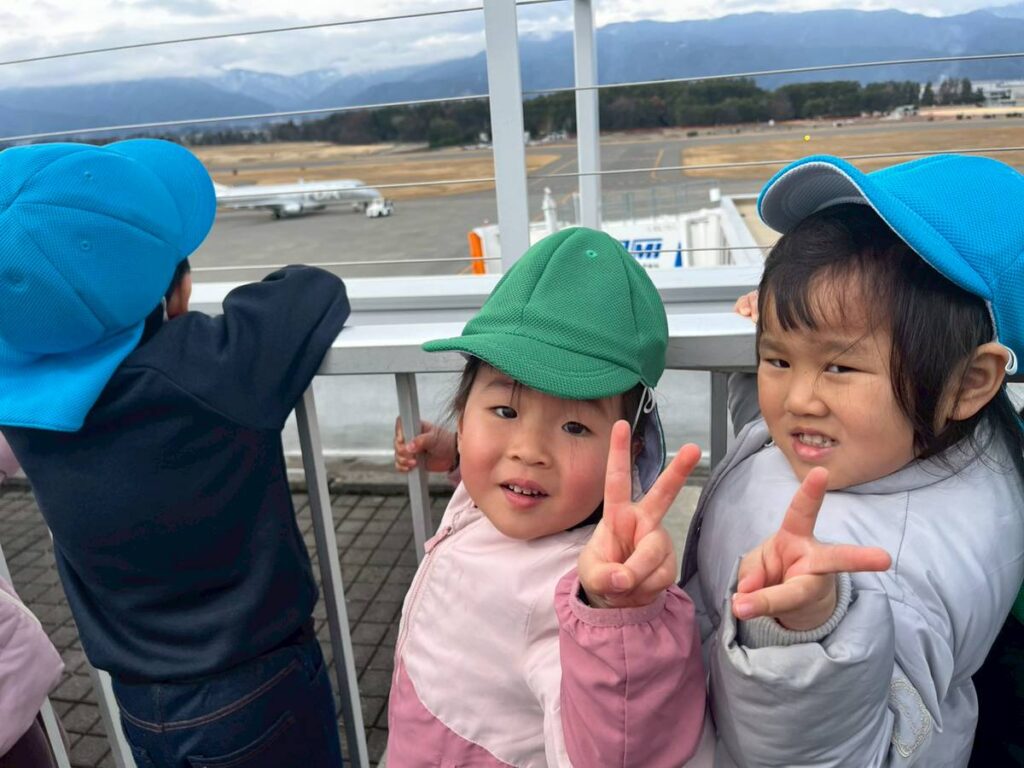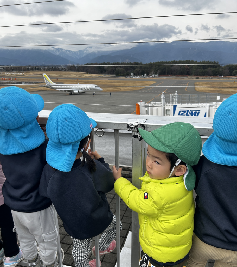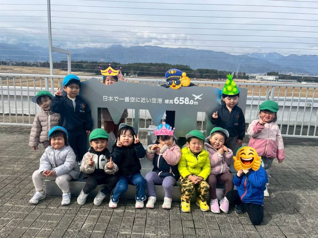 WaterfallとCanyonは、バスに乗って松本空港へ出かけ、地域や日本、そして世界とつながる交通について学びました。展望デッキに立ち、離陸する飛行機に「いってらっしゃい!」と声をかけました。高く飛び立つパイロットが手を振ると、子どもたちは目を輝かせながら、「どこへ行くのかな?」と想像をふくらませていました。